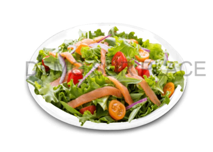 Salade, tomates, artichauts marinés, avocat, saumon fumé, citron.