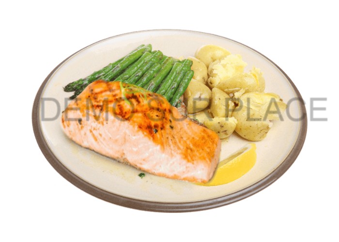 A la crème de pesto Servi avec frites maison, haricots verts, pâtes, salade verte.